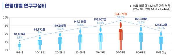한때 젊은 신혼부부의 유입으로 활기를 띠던 도시가 이제는 중장년층 중심으로 재편되고 있다는 의미다. 실제로 연령대별 비중에서도 50대가 가장 큰 축을 차지하며, 인구의 중심이 중장년층으로 이동한 모습이다.