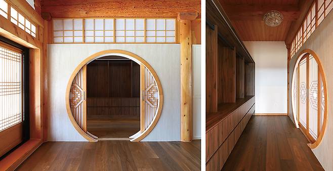 주방 공간에서 원형 문살 도어를 열면 또 하나의 풍경처럼 드레스룸이 펼쳐진다. 넓지 않은 공간이지만, 그 안에 담긴 분위기만큼은 특별하다. 한옥 고유의 곡선미와 따뜻한 디테일이 어우러진 이 드레스룸은 단정하면서도 여운이 남는다. 가구는 바닥 컬러에 맞춰 톤을 통일하고, 시각적인 여유와 개방감을 위해 전면 오픈장 구조로 설계했다. 서랍과 옷봉으로만 구성된 미니멀한 구조 덕분에 공간은 훨씬 넓고, 정돈되어 보인다. 상단에는 은은한 조명이 매립되어 고급스러운 분위기를 유지하며, 비교적 작은 면적 안에서도 기능성과 감성을 모두 만족시키는 특별한 드레스룸으로 완성되었다.