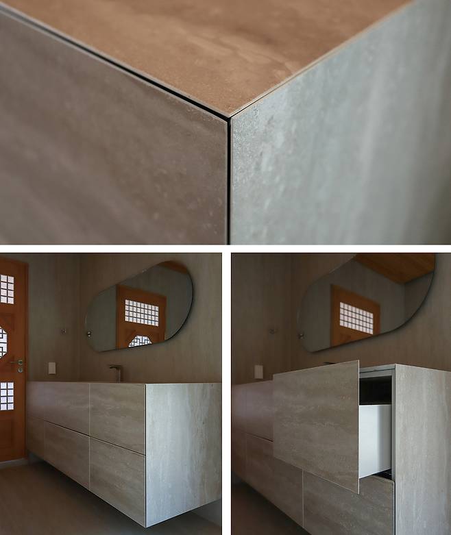 전체 벽과 바닥에 어두운 색감의 타일을 사용해 차분하고 안정된 분위기를 연출한 공용 욕실이다. 욕실 가구는 주방 아일랜드와 동일한 세라믹 마감재를 적용하여 공간 간의 재료적 연결성과 디자인 통일감을 이어갔다. 상판과 측면, 서랍까지 모두 같은 세라믹으로 마감해 단단한 조형미와 함께 한층 더 고급스러운 질감을 완성했다. 자연 그대로의 패턴이 담긴 세라믹은 조명과 만나 은은한 반사광을 만들며, 작은 공간임에도 깊이 있는 무드를 자아낸다.