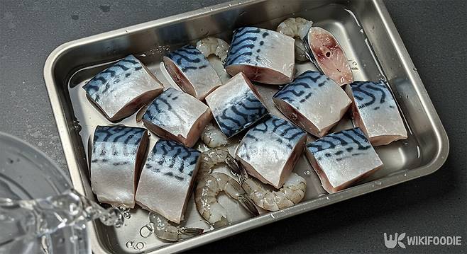 대파 한 대는 어슷썰고, 홍고추 한 개와 청고추 두 개는 동글동글 썬다. 양파도 한 개 준비한다. 고등어는 깨끗하게 손질해 준비한다. 비린내 제거를 위해 식초 3큰술을 넣고 조물조물 문지른 뒤, 흐르는 물에 헹군다. 이 작업을 통해 트리메틸아민이라는 비린내의 원인이 제거된다.