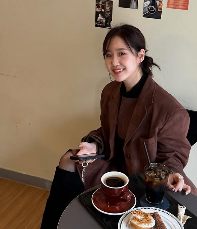 브라운 자켓과 스커트 셋업으로