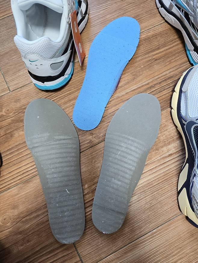 깔창은 보메로만 약간 접착 물질로 붙어있는데 그냥 신었다가는 나중에 세탁할때 떼어내기 힘들까봐 잡아 뜯어놨습니다
