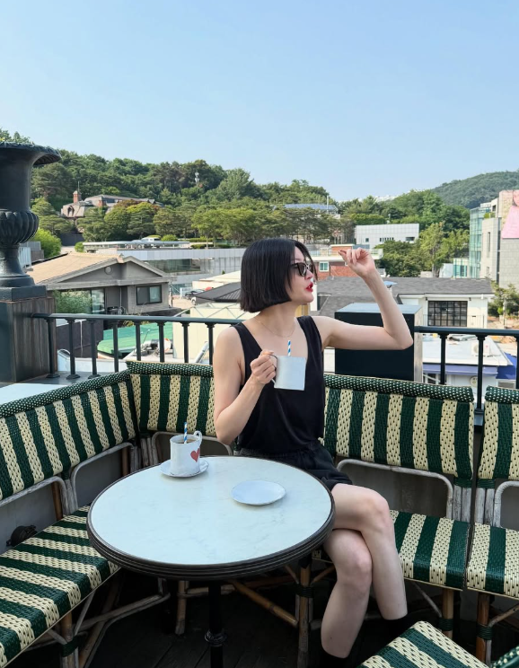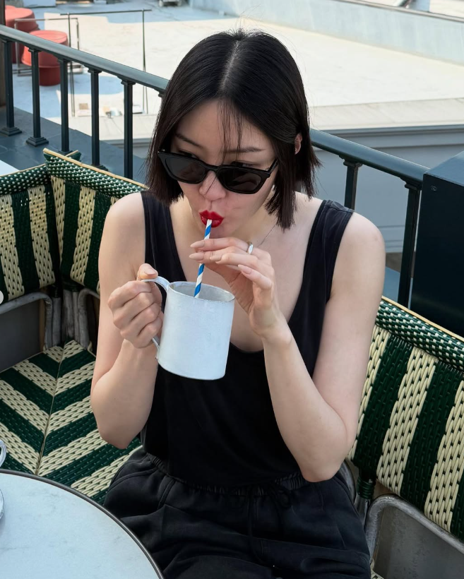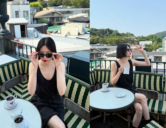 한 손엔 커피잔을, 또 한 손엔 태양을 가린 듯 선글라스를 조심스레 올리는 포즈는 여유로운 일상 속에서도 감각적인 스타일을 보여준다.