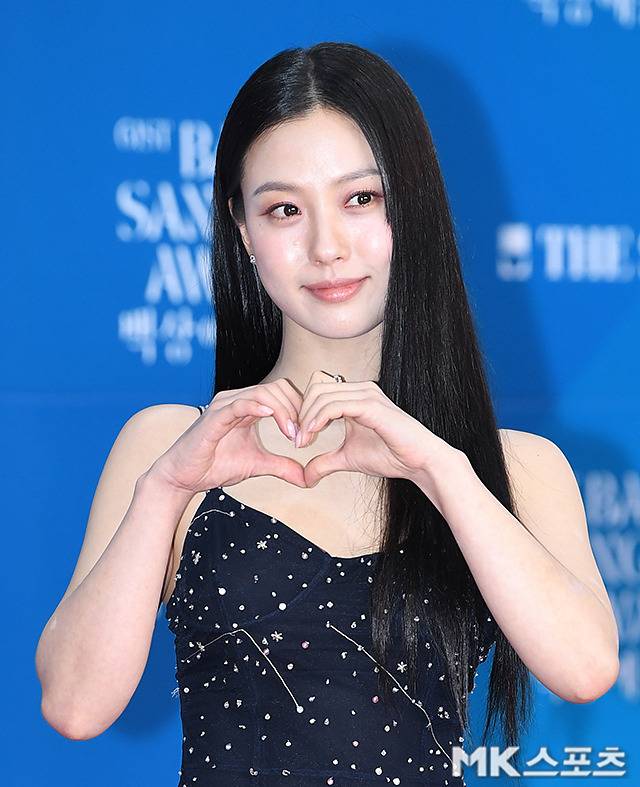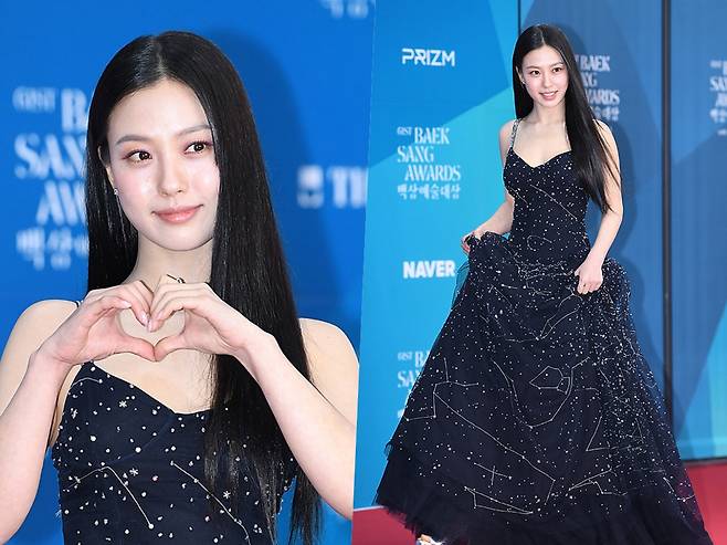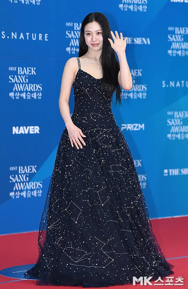 배우 고민시가 제61회 백상예술대상 레드카펫에 별자리 자수와 비즈 디테일이 돋보이는 네이비 볼륨 드레스를 입고 등장해 시선을 사로잡았습니다.