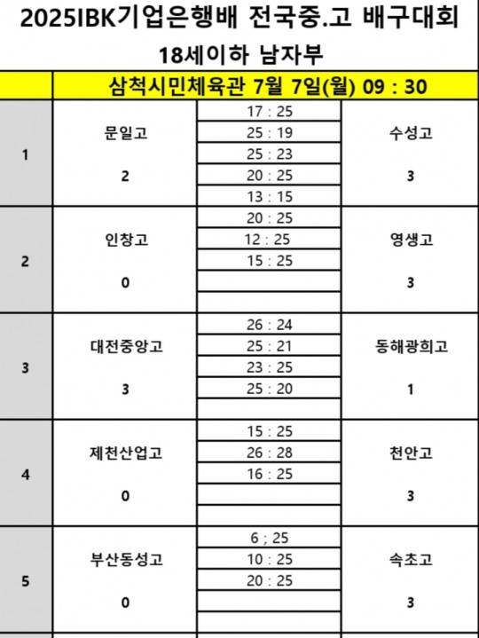남성고는 7일 강원 삼척실내체육관에서 열린 대회 18세이하 남자부 F조 예선 첫 경기에서 경북사대부고를 맞아 우세한 조직력을 발판으로 삼아 세트스코어 3-0(25-16,25-15, 25-17)로 완승을 거두었다.