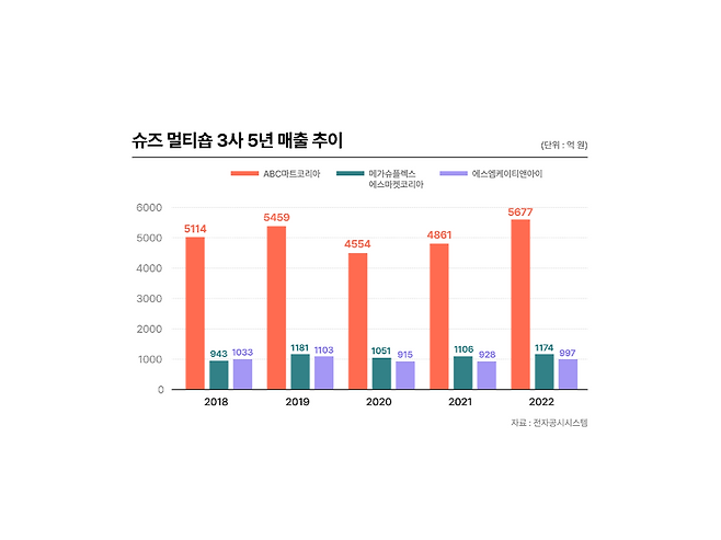 그런데 이 와중에 승승장구하는 멀티숍도 있어요. 시장 1위인 ABC마트코리아예요! 2022년 연 매출은 5677억원. 전년(4861억원) 대비 16%나 늘면서 역대 최고치를 찍었어요. 코로나 전인 2019년(5459억원)보다도 높아요.