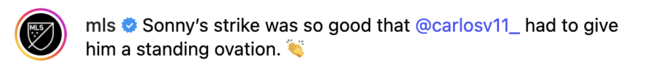 MLS 사무국은 22일 공식 인스타그램 계정에 손흥민의 역전골 장면을 업로드하면서 "손흥민의 득점이 워낙 환상적이어서 카를로스 벨라도 기립 박수를 보낼 정도였다"고 조명했다.