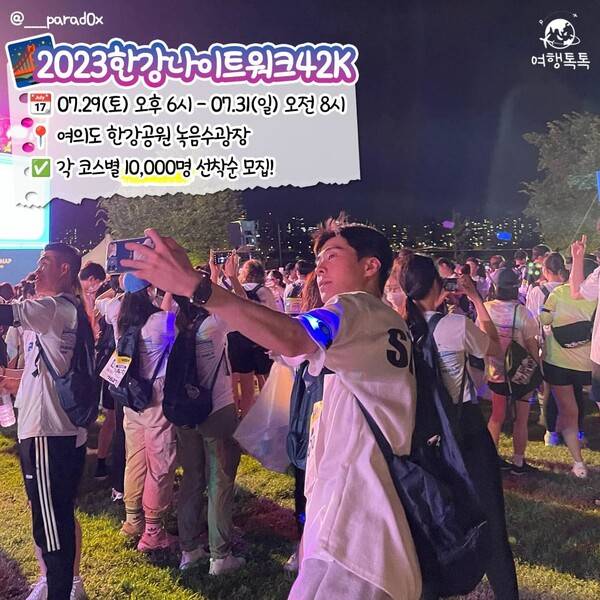 2023 한강 나이트워크 또한 7월 29일 토요일부터 일요일까지 개최됩니다. 각 코스 시간별 10,000명의 참가자가 모집되면 마감되므로 관심이 있다면 빠르게 신청해둬야겠네요.