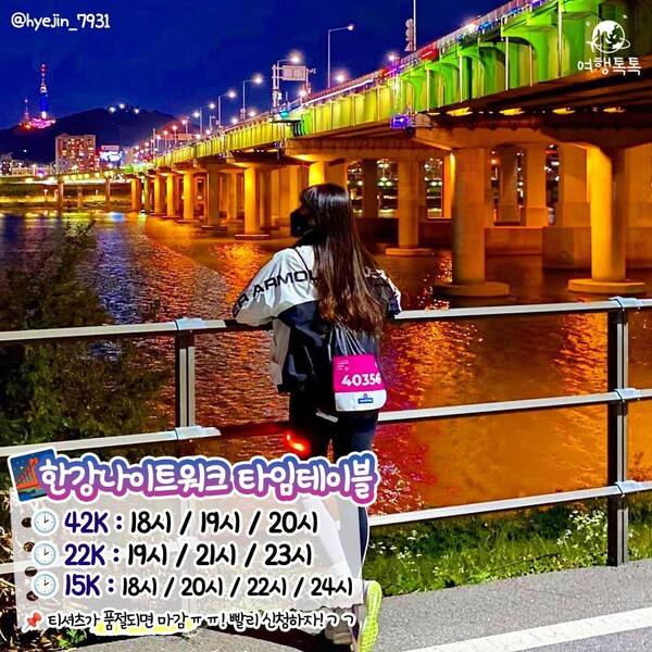 오늘은 7월 말 예정되어 있는 한강 나이트워크 2023의 모든 정보를 정리해드렸습니다. 아직 자세한 코스 정보는 나오지 않았지만 작년 코스와 크게 달라지지 않을 것으로 보입니다.