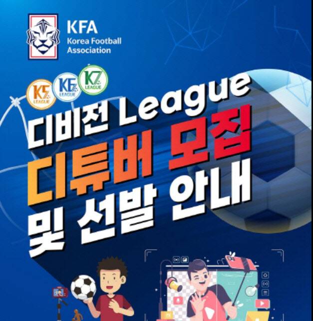 KFA는 21일부터 30일까지 K5·K6·K7 디비전 리그에서 활동할 디튜버를 모집한다. 디튜버는 디비전 리그를 소재로 한 영상 촬영 및 제작, 콘텐츠 기획 및 제작 활동을 하는 유튜버를 의미한다. 디튜버가 제작한 영상 콘텐츠는 KFA K5, K6, K7 유튜브 등에 업로드된다.