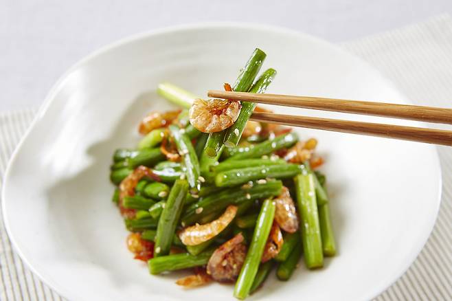 마늘종과 마른 새우를 함께 조리하면 맛뿐만 아니라 건강에도 유익한 조합이 된다.