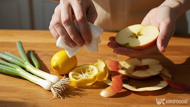 레몬껍질은 강한 산성과 향을 동시에 갖춰 비누 없이도 냄새를 덮는 데 효과가 있다. 단, 손에 상처가 있는 경우 따가울 수 있다. 사과껍질은 냄새 흡착 효과가 있지만, 다른 재료보다 냄새 제거력은 떨어진다는 평가다.