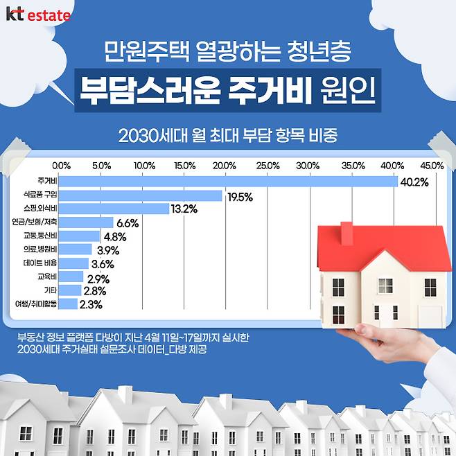 이렇게 젊은이들이 만원주택에 관심을 갖는 이유는 부담스러운 주거비 때문입니다. 부동산정보 플랫폼 ‘다방’을 운영하는 스테이션3이 지난 4월 2030세대 1547명을 대상으로 조사한 결과, 전체 응답자의 40.2%가 월 소비 항목 중 가장 부담되는 지출 항목으로 ‘주거비’를 지목했습니다. 주거비 부담 체감도 질문에는 34%가 ‘높다’, 16.9%가 ‘매우 높다’고 답했습니다.
