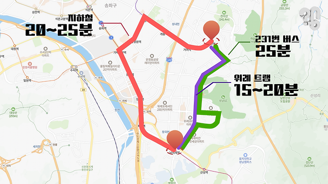 출퇴근 시간대는 5분, 다른 시간대에는 10분 간격으로 총 10대의 트램을 돌리면 위례 신도시 내부 교통난을 일부 해소할 수 있다는 게 서울시와 정부의 설명이다. 진짜 그럴까? 운송 수단별 소요 시간을 한번 시뮬레이션 해 봤다.