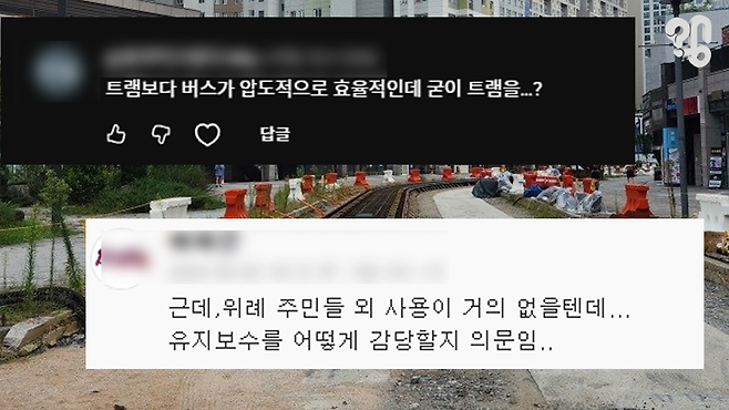 사진에는 ‘위례 주민 말고는 트램을 안 탈텐데, 유지 보수가 제대로 될지 궁금하다’ ‘버스가 훨씬 빠를 것 같은데 세금낭비 아니냐’는 부정적 댓글이 주로 달렸다.