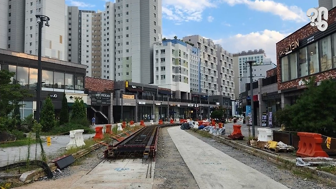 이 사진을 보라. 지난해 9월 커뮤니티에 올라온, 위례신도시에 트램 레일을 까는 공사 현장 모습.