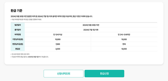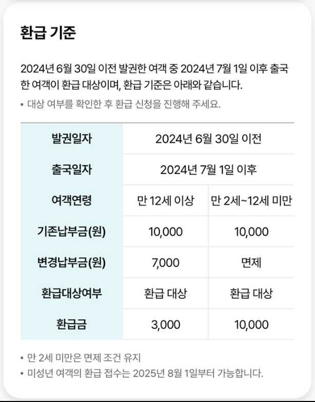 그리고 만 12세 미만의 어린이는 납부 전액 환급 대상이에요. 현재는 성인만 환급 신청이 가능하고, 어린이는 8월 1일부터 별도 신청이 가능하니, 아이와 함께 출국한 가족이라면 8월 이후에 한꺼번에 신청하는 게 더 편리하겠죠?