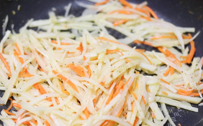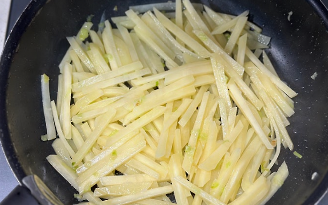 감자채를 볶을 때 올리브오일은 강한 불보다는 중약불에서 사용하는 것이 좋습니다. 이렇게 하면 기름이 산화되는 것을 막고, 감자의 식감도 아삭하게 유지됩니다. 마늘, 파프리카, 양파 등을 함께 넣으면 항산화 효과와 비타민 섭취량을 더욱 높일 수 있습니다.