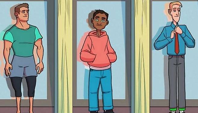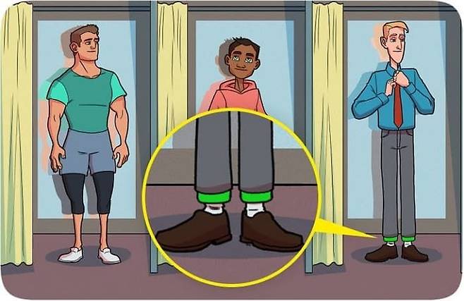 불과 조금 전까지만 하더라도 있던 녹색 바지가 감쪽 같이 사라진 것인데요. 그런데 그때 옷 가게 안에는 다음 그림 속의 세 사람이 탈의실에 들어가 있었다고 합니다.