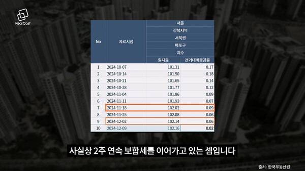 한국부동산원에 따르면 12월 1주 마포구 아파트값은 전주 대비 0.06% 오르며 전주와 동일한 상승폭을 유지했습니다.