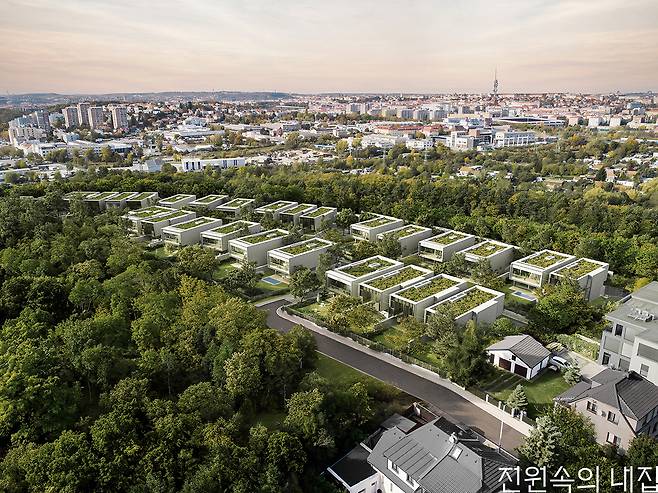 프라이버시를 고려해 다양한 소재로 미니멀스타일을 완성한 주택단지. 큰 창으론 짙은 녹음과 햇빛, 그리고 프라하의 전경이 담긴다.