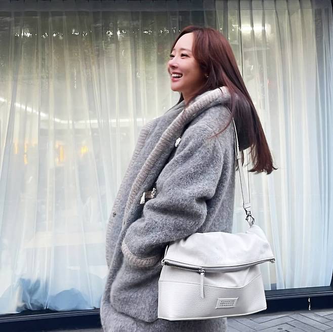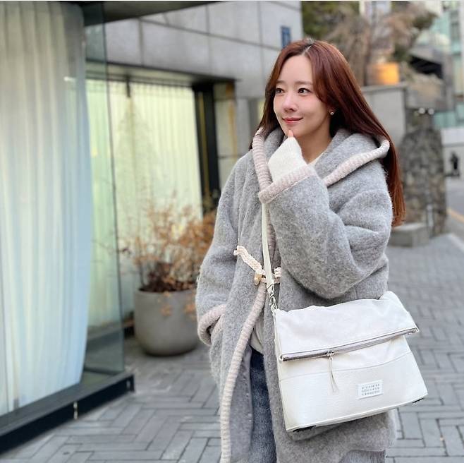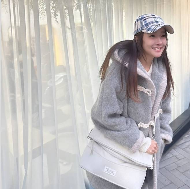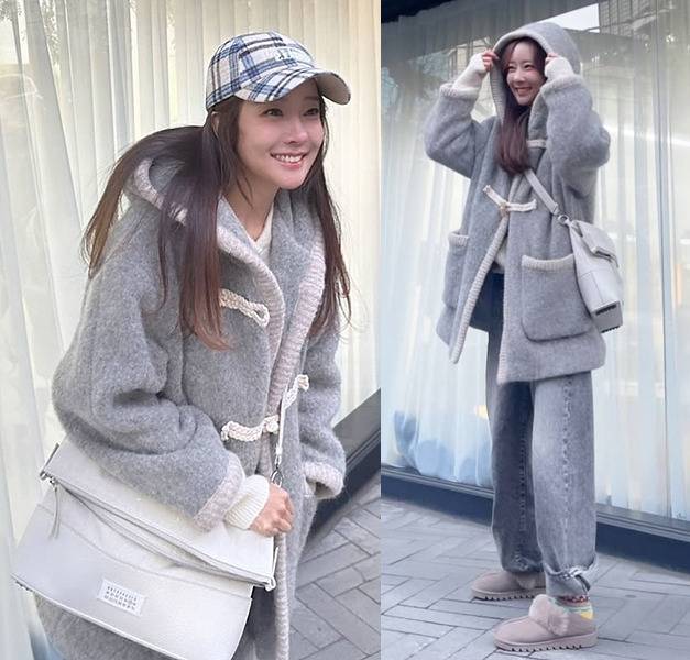 소유진은 포근한 질감의 그레이 더플코트를 착용해 차분하고 아늑한 분위기를 자아냈습니다.