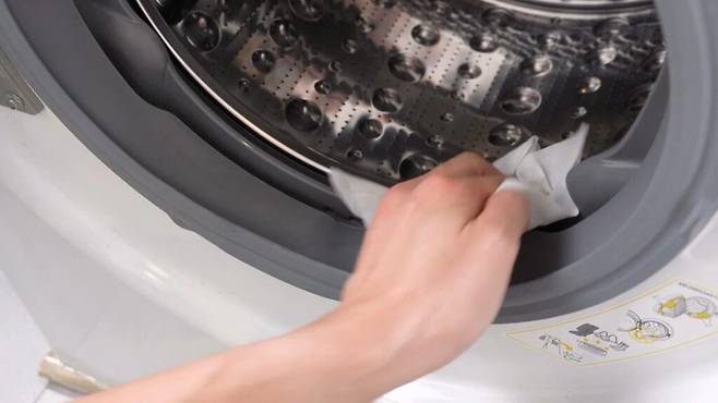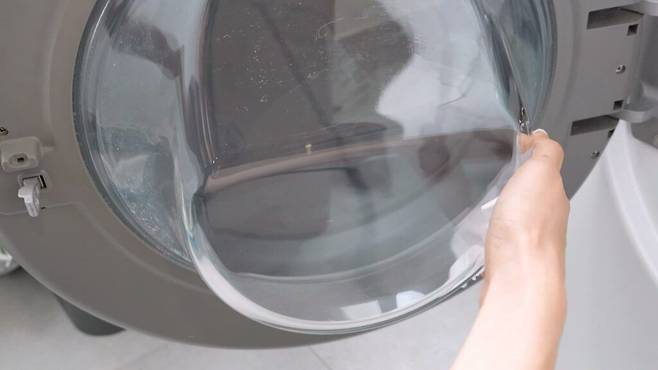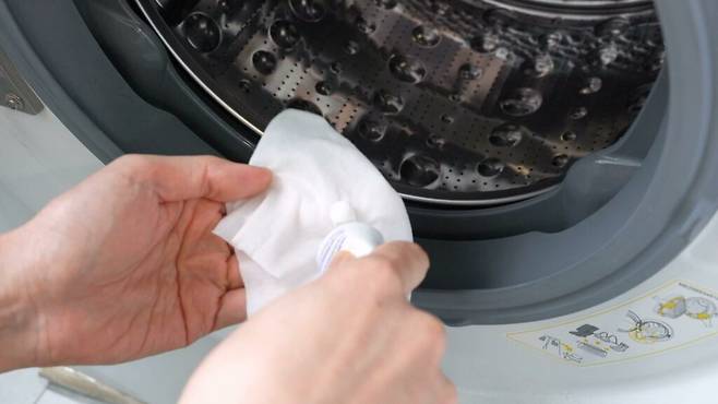 세탁기 문의 고무패킹도 관리를 잘해야 하는데요. 먼저 물티슈 한 장을 이용해 고무패킹 안쪽에 낀 먼지와 이물질을 제거하세요.