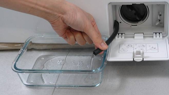 먼저 용기 하나를 준비해 배수호수에 있는 물을 모두 제거하세요. 물을 제거하지 않고 배수 필터를 빼면 물이 새어 나올 수 있어요.