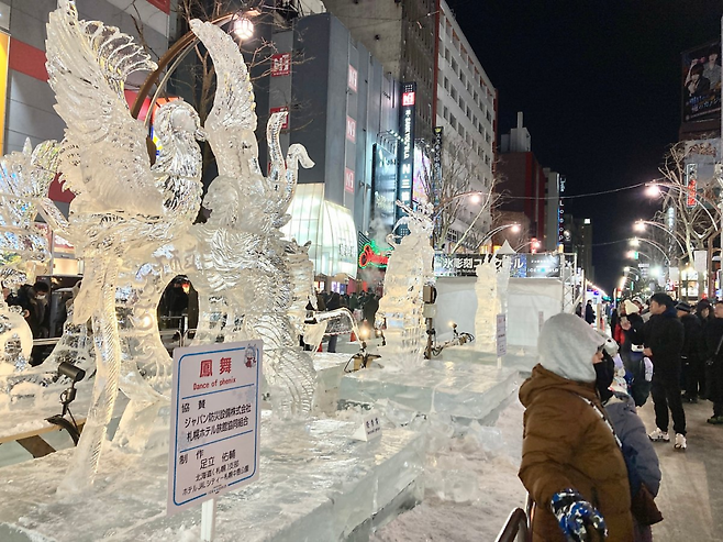 삿포로 눈 축제의 주 행사장은 오도리 공원입니다. 공원의 길이는 약 1.5km로, △오도리 행사장 △스스키노 행사장 △츠도메 행사장을 포함해 12개의 초메(구역)로 나뉘어 있습니다. 오도리 행사장에는 웅장한 눈 조각상들이 늘어선 거리를 걸으며 겨울의 낭만을 만끽할 수 있어요. 특히 밤에는 눈 조각상들이 조명으로 빛나며 환상적인 분위기를 연출해 더욱 아름답습니다.