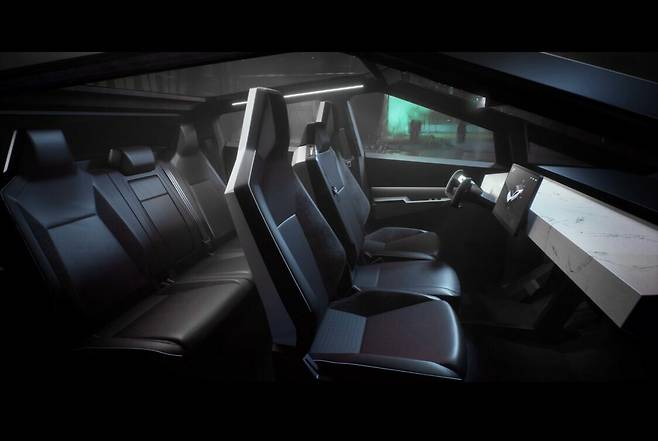 전체적으로 미니멀한 인테리어의 사이버트럭은 넓은 실내 공간과 다양한 편의 기능을 갖출 것으로 보인다.