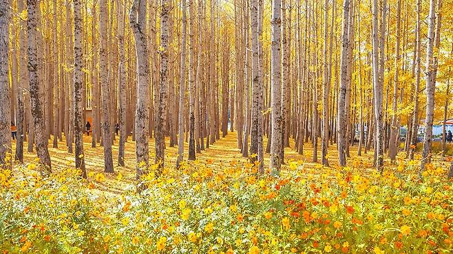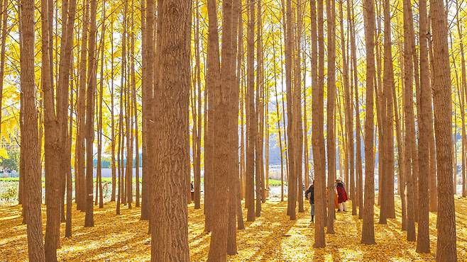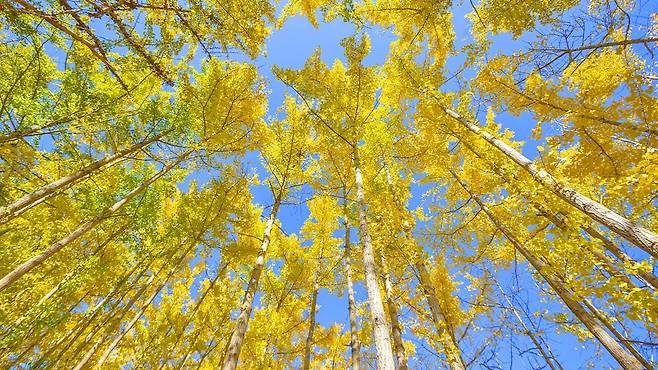 수십 미터 높이로 자란 은행나무들이 빽빽하게 들어선 숲은 그 규모는 크지 않지만, 걷는 것만으로도 가을의 정취를 오롯이 느낄 수 있습니다.