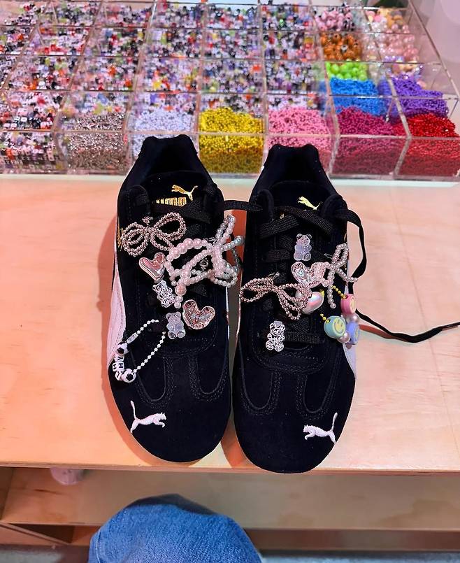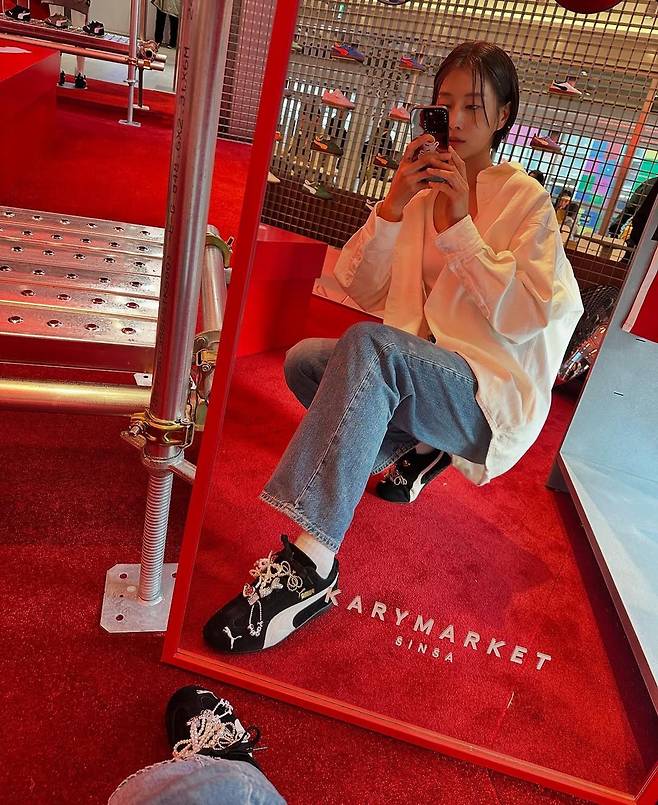 공개된 사진 속에서 이현이는 심플한 화이트 셔츠와 데님 팬츠를 입고 거울 셀카를 찍고 있다. 하지만 가장 눈길을 사로잡는 건 그녀의 신발이다. 블랙 컬러의 푸마 스피드캣 스니커즈 위에 진주, 리본, 하트 장식 등 다채로운 액세서리를 더해 개성 넘치는 스타일을 완성했다.