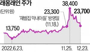 하지만 벤처캐피털(VC) 메이플투자파트너스와 에스비아이-성장사다리 코넥스 활성화펀드 제2호의 장내 지분 매각 공시가 잇따라 나오며 주가는 내리막길을 걷고 있다. 이후 차익 매물이 쏟아지며 토요일 15회를 앞둔 23일 래몽래인 주가는 2만3700원. 고점 대비 40% 가량 떨어졌다. '재벌집 막내아들' 방영 전 주가인 지난달 18일 2만3300원보다 딱 400원 올랐다.