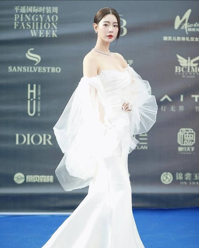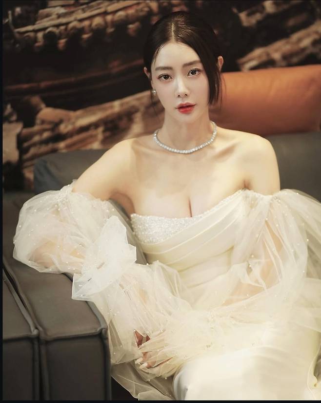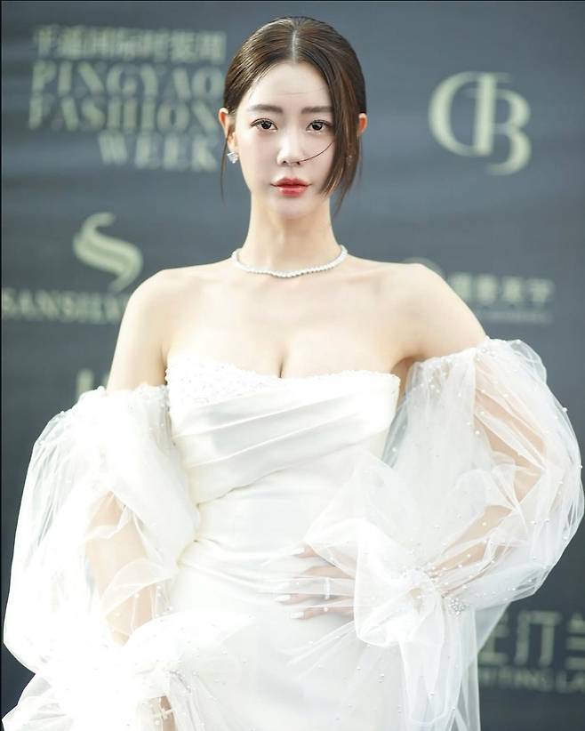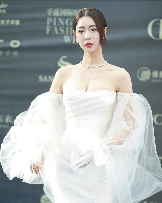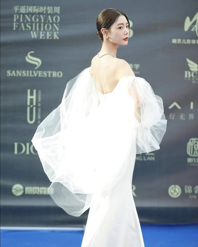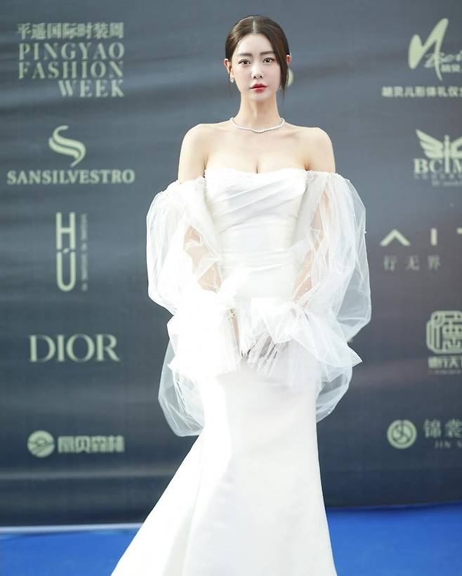 볼륨감 있는 시스루 소매는 로맨틱한 분위기를 극대화했고, 길게 떨어지는 드레스 라인이 완벽한 몸매를 강조하며 눈길을 사로잡았습니다.