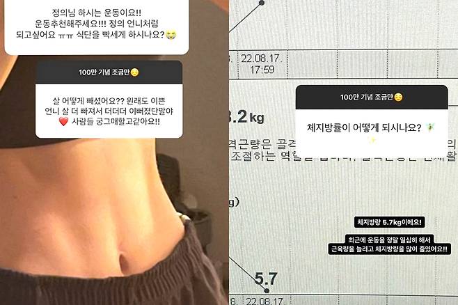 또한 체지방량을 묻는 팬의 질문에는 인바디와 함께 근육량, 체지방량을 공개했다.