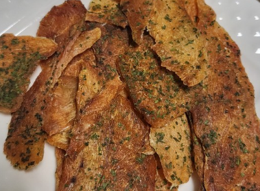 - 설명: 닭가슴살을 얇게 썰어 오븐이나 에어프라이어로 바삭하게 구운 간식입니다. 소금이나 허브로 간을 약간 추가하면 맛있게 즐길 수 있습니다.