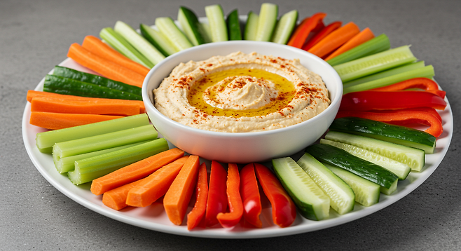 - 설명: 셀러리, 오이, 당근, 파프리카 같은 생채소를 스틱 형태로 썰어 후무스(병아리콩 디핑 소스)와 함께 즐길 수 있습니다. 후무스는 병아리콩, 올리브오일, 레몬즙, 마늘 등으로 만들어진 고단백 저탄수화물 소스입니다.