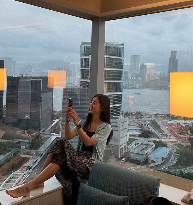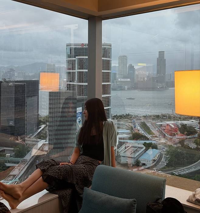맨발로 창가에 앉은 편안한 모습은 현재의 여유로운 삶을, 화려한 스커트는 대중이 기억하는 배우로서의 아우라를 동시에 보여주며 완벽한 균형을 이뤘다.