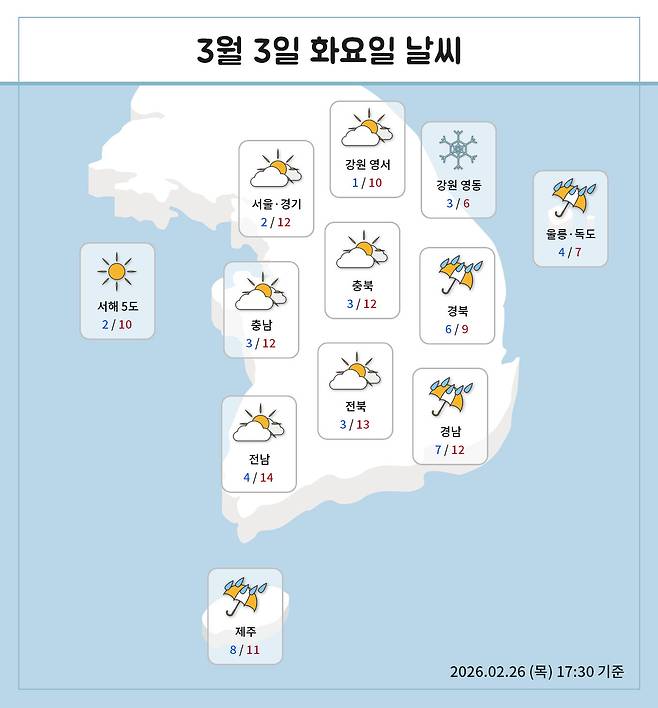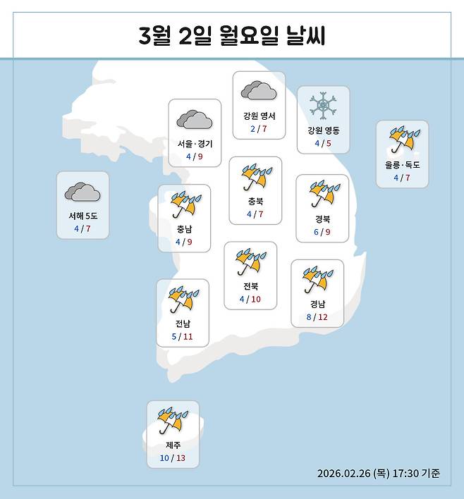 화요일 역시 남부와 제주에는 비가,