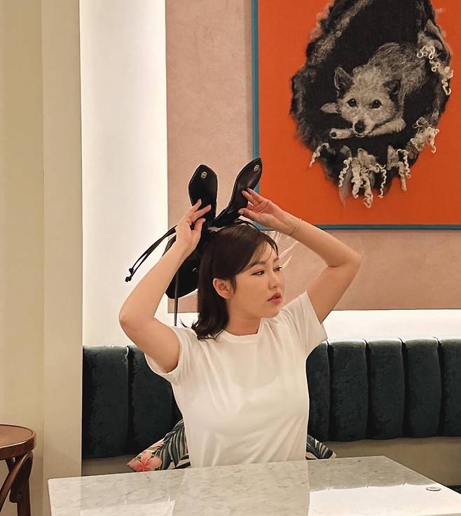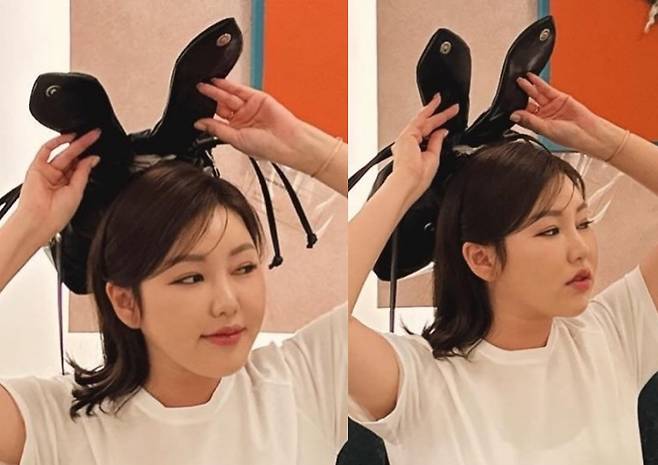 가수 송가인이 가방에 달린 토끼 귀를 머리에 올려 명랑하고 귀여운 느낌을 뽐냈습니다. 또한 잔머리를 가닥가닥 뭉쳐 이마를 살짝 가려주어 스타일리시한 헤어스타일을 완성했습니다.