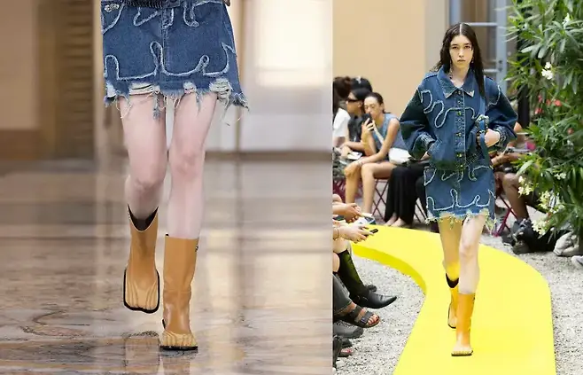 앤더슨벨은 24S/S 밀라노 맨즈 패션위크에서 카우보이를 연상시키는 데님 제품을 많이 선보였는데, 그중에서도 ‘MIAKO WAVE DENIM SKIRT’를 추천한다. 앤더슨벨의 아이템은 평상복으로 입기 부담스러울 만큼 과장되고 예술적인 디자인들이 많은데 이 제품은 비교적 과하지 않아 코디하기도 쉬울 듯하다. 바람을 가르는 듯한 물결 모양 절개 디테일에 험난한 서부 생활로 찢어진 듯 언발란스한 밑단의 조합이라니. 여기에 허리에 아일렛 디테일까지. 이만큼 카우보이룩에 잘 어울리는 청치마가 있을까? 투박한 워커나 카우보이 부츠를 대충 신어주기만 하면 카우보이룩 완성. 구매는 여기.(https://tinyurl.com/3wpa7r5b)