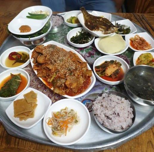 옥포국제시장에서 가장 유명한 중앙식육식당은 '백종원의 3대천왕'에도 소개된 백반 맛집입니다. 이곳의 대표 메뉴는 가자미가 나오는 일반 백반정식과 두루치기 정식입니다.