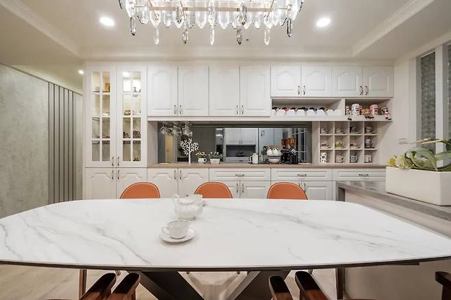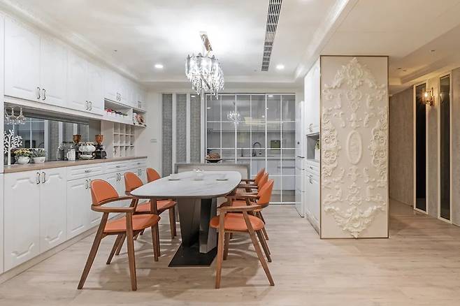 거실과 이어지는 식당 공간은 자연스럽게 주방으로 이어집니다. 이 공간의 하이라이트는 조각된 꽃 문양이 들어간 몰딩 벽면입니다. 벽체는 골드 톤의 메탈 라인으로 마감되어 있으며, 식탁은 도자 테이블과 듀폰 계열의 인조석 바 흐름 위로 이어져 자연스러운 동선을 자랑합니다.
