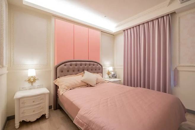 이 방은 그레이 핑크 톤을 중심으로 한 벽지와 실버 펄 텍스처가 조화를 이루어 가장 따뜻하고 부드러운 분위기를 자아냅니다.
