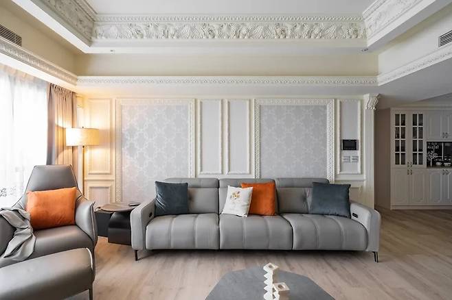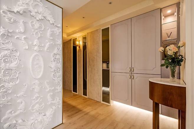 입구에 들어서자마자 눈길을 사로잡는 현관은 마치 극장 무대처럼 꾸며져 있습니다. 이곳의 벽면은 고급스러운 벽지와 회색 거울, 그리고 선형 몰딩이 겹겹이 쌓여 깊이 있는 느낌을 줍니다.