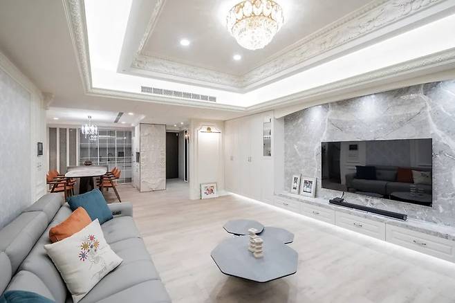 공간을 감싸는 주요 소재는 아테네 그레이 마블로, 압도적인 크기의 TV 벽면은 대칭적인 몰딩과 광택 있는 클래식 벽지가 어우러져 거실 전체에 무게감을 부여합니다.