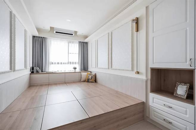 다다미방이라는 특별한 공간은 주로 손님방으로 사용되며, 가볍고 따뜻한 우드톤을 메인으로 하여 몰딩 디테일과 조형 벽지가 절묘하게 조화를 이룹니다.