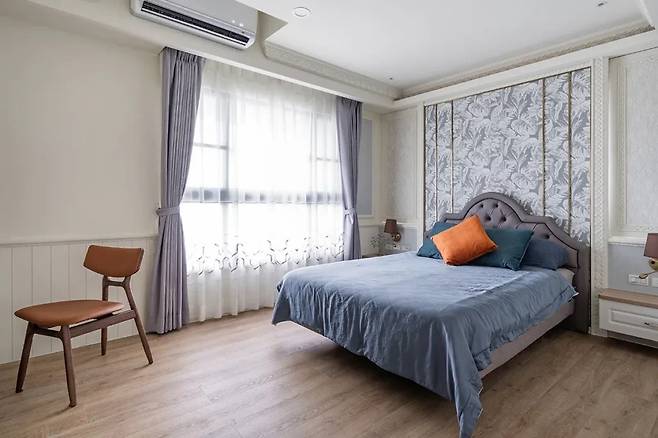 햇볕이 가득 들어오는 메인 침실은 남편의 취향을 반영한 디자인으로 꾸며졌습니다. 침대 헤드 양옆으로 슬라이딩 도어를 숨겨 채광과 벽면의 입체감을 동시에 살렸습니다.