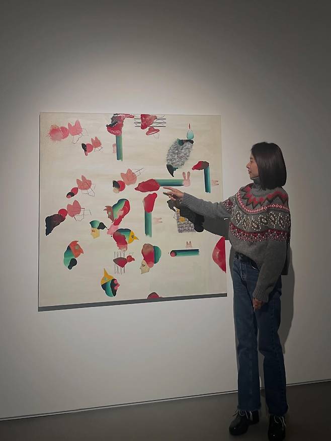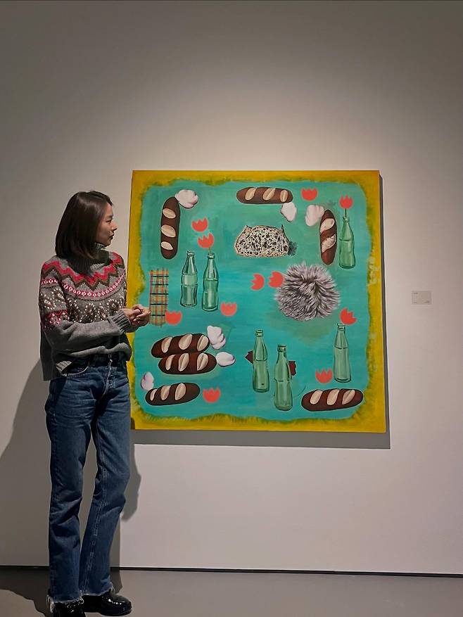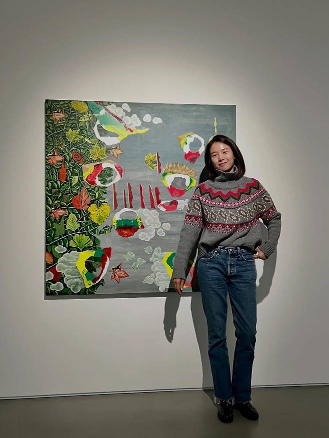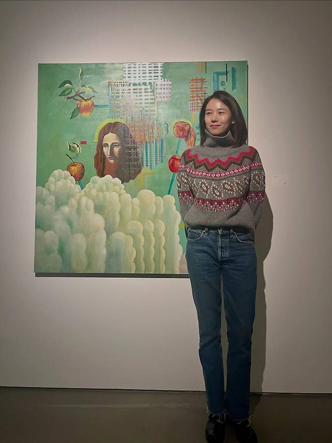 작품을 감상하며 미소 짓는 조윤희의 단정한 단발 헤어스타일은 니트의 높은 넥 라인과 조화를 이뤄 얼굴을 더욱 작아 보이게 연출하는데요.