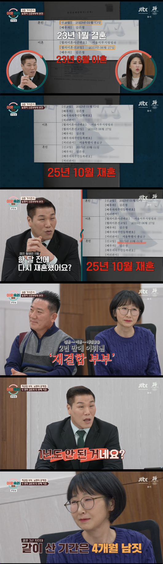 무엇보다 출연진을 놀라게 한 것은 이들의 결혼 생활 기간이었다. 부부는 2023년 1월 7일 결혼식을 올리고, 엿새 뒤인 1월 13일 혼인신고를 마쳤다. 하지만 행복해야 할 신혼의 단꿈은 오래가지 않았다. 불과 11일 뒤인 1월 24일, 아내가 짐을 싸서 집을 나오며 별거에 들어간 것.